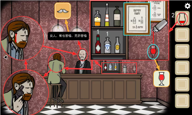 柜台视角:按照厕所视角墙上获得的配方,分别点击伏特加和tabasco辣酱一次,杯子里的(血)两次,点击两次调酒器后调出一杯(血腥玛丽),同时获得成就(血腥玛丽),将酒交给鲍勃让他喝下后,他从怀里掏出一把枪,往自己的太阳穴开了一个窟窿;鲍勃自杀后点击乌鸦先生,获得成就(女人...)。