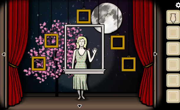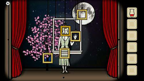 舞台视角:将四颗(白方块)放入相框里,暂时多出了一个相框我们可以先不管它;将相框按照舞台上对应的位置放置,放置成功后相框上会多一圈白线;点击月亮上的相框,按住之后像擦玻璃一样把雾气擦掉,获得提示;点击手上的相框,点击一下手掌再擦拭手腕,获得提示;点击大相框上的相框,分别擦拭第二行的右侧和第四行的左侧,获得提示;点击树上的相框,擦拭树干,获得提示。