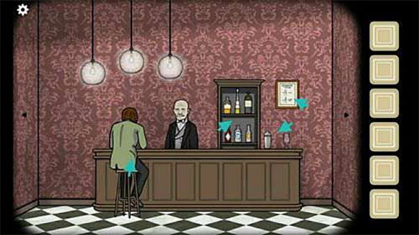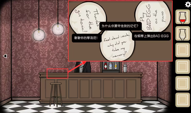 柜台视角:酒保乌鸦先生叫我们给坐在柜台边的鲍勃一杯酒,点击柜台上的调酒器,按照墙上的配方,分别点击伏特加和橙汁两次,点击两次调酒器后调出一杯(螺丝起子鸡尾酒),获得成就(螺丝刀),将酒交给鲍勃让他喝下后,他从嘴里吐出一把(螺丝刀);拿回鲍勃手里的(鸡尾酒杯),根据《生日》里从祖父上衣口袋里得到的配方,分别点击杜松子酒和汤尼水两次,点击两次调酒器后调出一杯(琴汤尼),获得成就(锈湖琴汤尼),将酒交给鲍勃让他喝下。
