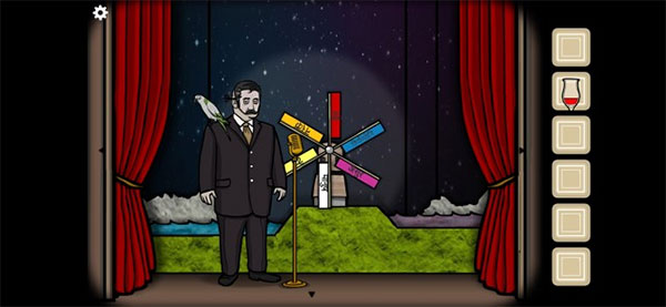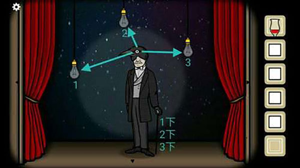 11、拉开帷幕,点击男人,根据男人伸出的手指头个数点亮灯泡,接着根据拐杖敲击的次数点亮灯泡,最后根据鸟眼望着的方向点亮灯泡,第四个节目结束。