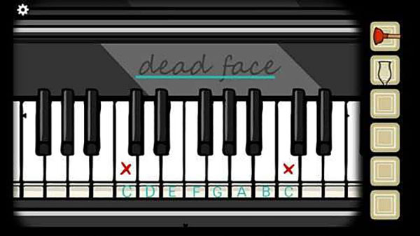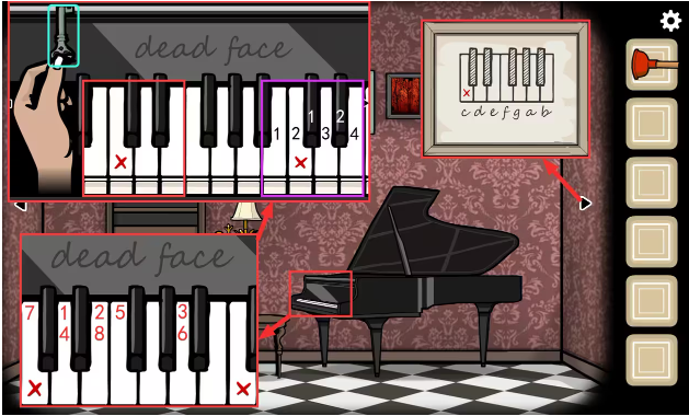 钢琴视角:点击钢琴,根据厕所视角墙上最左侧的提示我们可以得知每个键位代表的音阶;把钢琴上的“dead face”按顺序敲击对应音阶的钢琴键弹奏出来,左侧的几个琴键落了下去,伸出一只手;点击手后手会弹奏红框范围内的琴键,我们要按顺序在紫框范围内弹奏对应的琴键(每次弹奏完后手就会弹下一次的琴键,如果没有看清可以点击手让它再弹一遍):