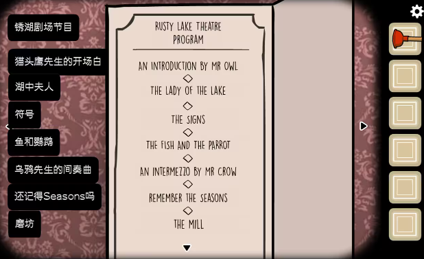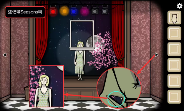 舞台视角:点击舞台幕布,《还记得Seasons吗》开始;点击坐在柜台旁的鲍勃,在他的口袋里发现一张劳拉的照片,点击翻转后是劳拉写给鲍勃的告别信,内容如图;我们按照照片布置舞台后,劳拉伸出了手,从舞台上升下五个小相框。