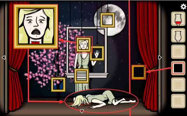 舞台视角:将(黑方块)放入最后一个相框里,将相框移到劳拉的脸前,点击相框,劳拉发出一声尖叫,喉咙出现了一道口子,最后倒在了血泊中;节目结束。
