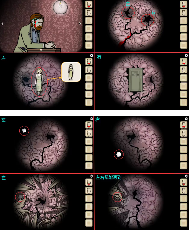 柜台视角:点击进入鲍勃太阳穴上的窟窿,点击几次窟窿后会遇到一个分叉窟窿,往左走会遇到鲍勃脑海里的劳拉,获得成就(那个女人),往右走会看到一扇门;在鲍勃的脑海里得到四颗(白方块)。