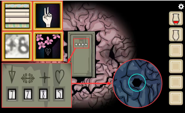 柜台视角:进入鲍勃太阳穴上的窟窿,进入右侧的窟窿来到门前,根据舞台和门上得到的提示,在门上输入“7285”,进入门后获得(黑方块),再次点击界面可以重新回到门前。