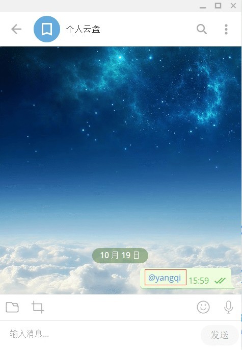 如果我们知道一个用户的用户名,我们可以随便打开一个对话框,输入@用户名,发送之后,再点击消息框中的用户名,就可以直接打开好友对话框,在这里我们可以直接跟对方沟通,也可以添加好友。我们以云盘对话框为例,输入@+用户名,