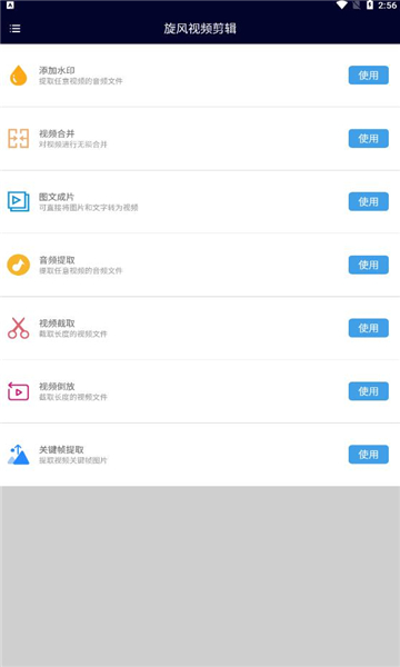 旋风视频剪辑是一款短视频剪辑工具APP,可以实现:图文一键生成视频、给任意视频添加水印、对多个视频进行快速合并、对长视频进行截取保存、提取视频里面的音频文件、对视频进行倒放、提取视频里面的关键帧等功能。