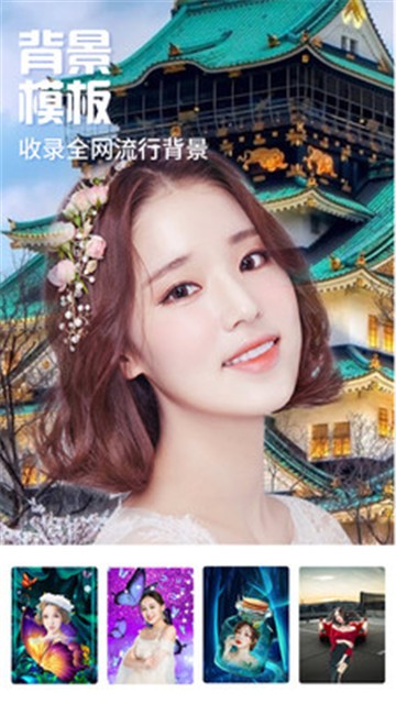 替换背景:内置上百套优质背景图库及贴图,更换想要的背景或选取相册自定义添加。