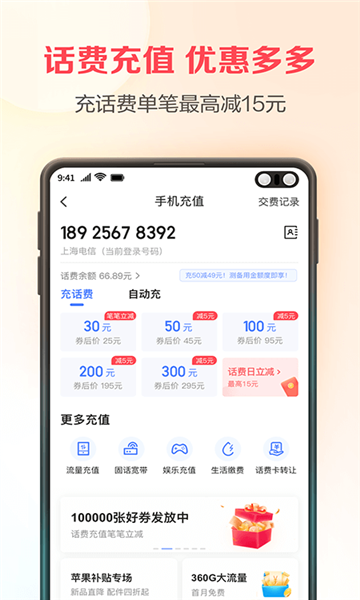 电信话费充值笔笔立减,更多每周五满10-15,满10-3,名额有限,先到先得。