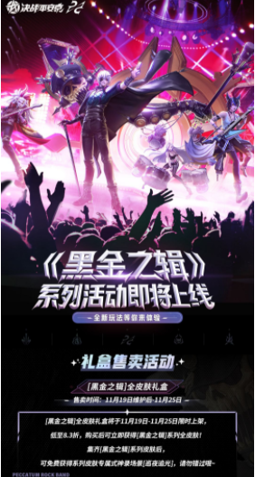 全新的音游主题活动,黑金之辑上线,玩家从11月19日开始就可以体验全新的主题内容,不同的主题礼包,趣味的音游活动玩法,还有各种主题皮肤等待玩家解锁手游,在活动期间玩家完成不同的任务,挑战不同角色的歌曲就可以解锁丰富的奖励,还可以挑战排行榜哦。