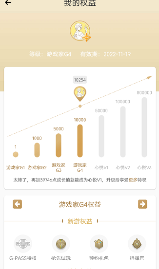 2、通过充值的方式提升会员等级,会员等级分别分为游戏家G1-G4、心悦V1-V3,当玩家的游戏充值金额达到5000的时候即可解锁心悦1;