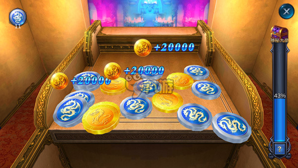 推币机想必大家都玩过的单机类游戏,将龙币投入到最前面的推板前,将龙币往前推,掉落的金币数量将是你获得的金币数。推币需要技巧,合理投放将会获得更高的金币奖励。右边有一个神秘大奖宝箱,达到100%将获得。