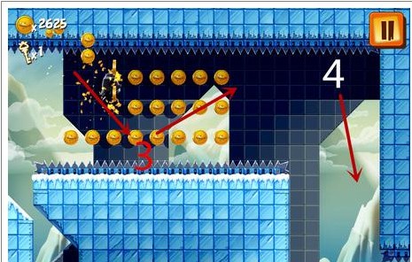 4.在4号位置的时候要马上用手指在屏幕上往下滑,让企鹅快速下降并且一直按住,让企鹅趴着滑过去。