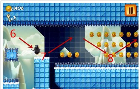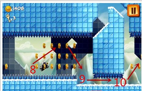 6.在6号小平台要准备好三连跳,三连跳其实也不难,7号位置快速起跳,落到8号位置的时候再次用手指在屏幕上往上滑动再跳。