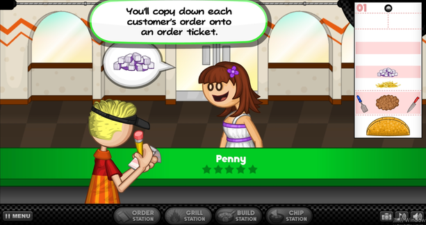 1、前往订餐站听那些客户的需求,随后切换到烧烤站做饭。