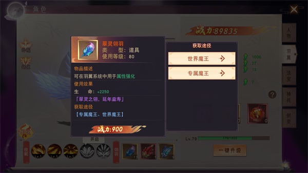 每日挑战专属魔王和世界魔王就有几率获得翠灵翎羽和碧鸾翎羽,翎羽能给翅膀增加不少的加成属性,战力也随之增长哦。