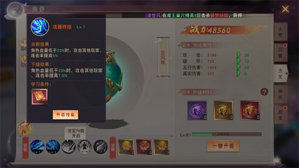 法宝升到指定等级就可以解锁新技能,新技能解锁之后可以使用技能书升级,法宝技能可以大幅增长战力。
