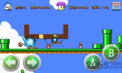 【内容】 游戏的模式比较简单,也就是闯关的模式,游戏设定中保留了用头顶、用脚踩等基本动作,一共有三次重生的机会,用完了就得重新开始了。游戏屏幕上方也会显示分数,剩余时间和得到的金币数。