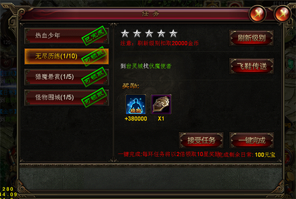 2、每日任务:前期后期主要经验获得之一,此类任务出现的环数略多,还能获得丰富的经验和绑定元宝