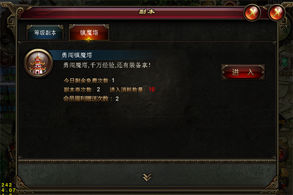 5、镇魔塔:前期后期主要获得经验方法之一。于副本一样,每日一次免费机会,购买副本卷轴课额外增加2次机会。开通青铜VIP可额外增加1次机会。开通黄金VIP额外赠送2次机会。