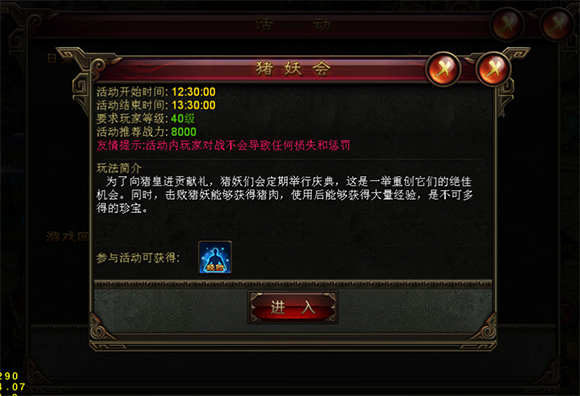 3、每日活动:每日中午12:30到1:30开始的猪洞活动,击杀猪王或猪皇可获得大量的猪肉,使用猪肉可获得大量经验奖励。