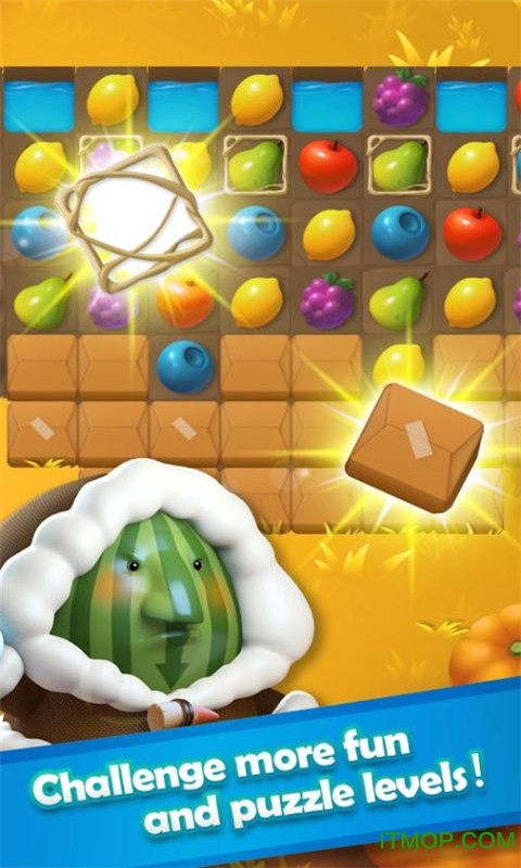 游戏玩法简单,玩家通过手指拖动屏幕交换两个相邻的水果,让他们能三个或者三个以上在一排或者一列,就可以完成消除。