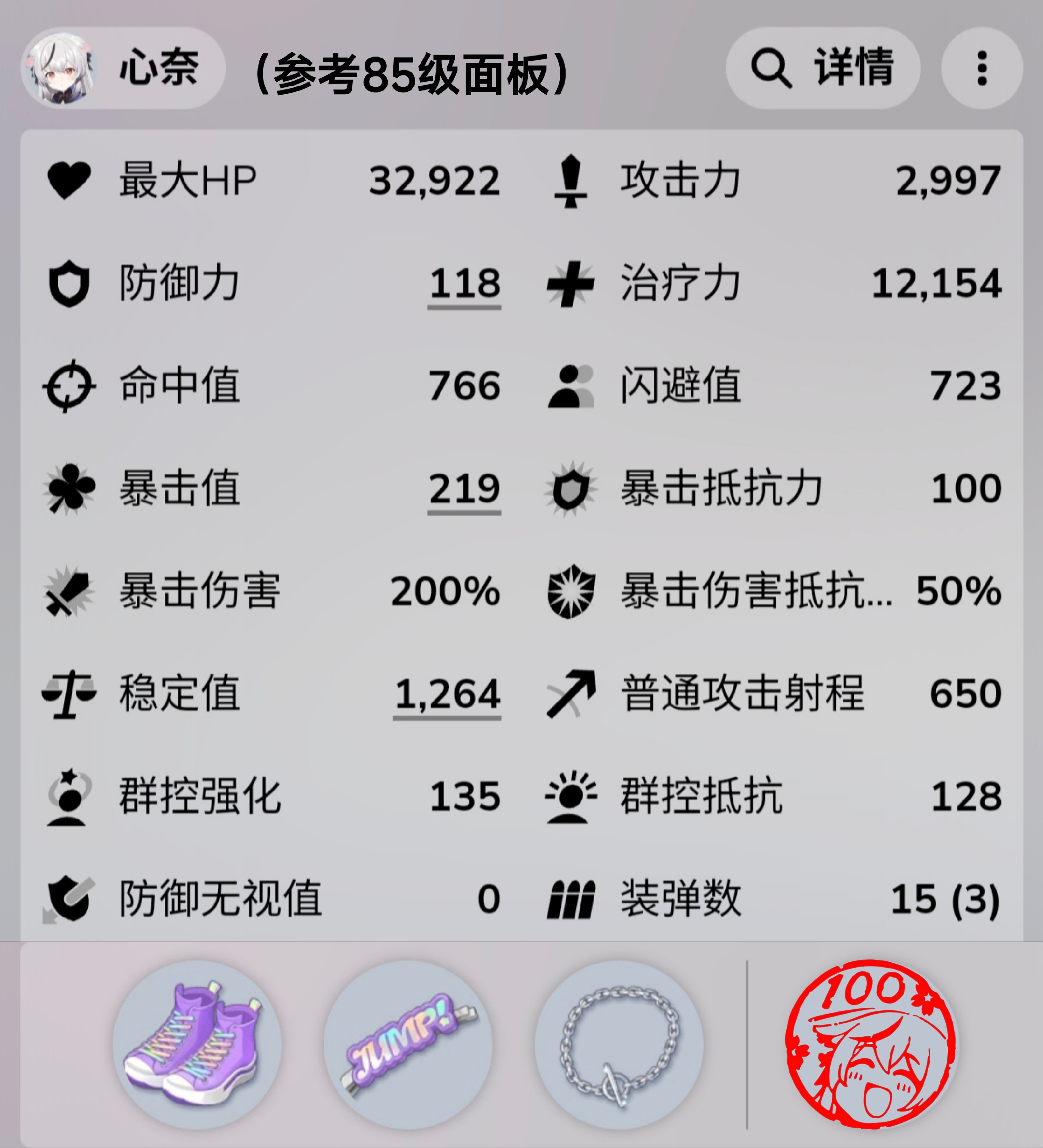 总结:心奈在推图的表现一般,除开核心技能的减费效果,心奈就是一位纯奶,所以能选择的学生也比较多,虽然核心技能限制较大,但在高难图中也是一把好手,泛用性相当高.