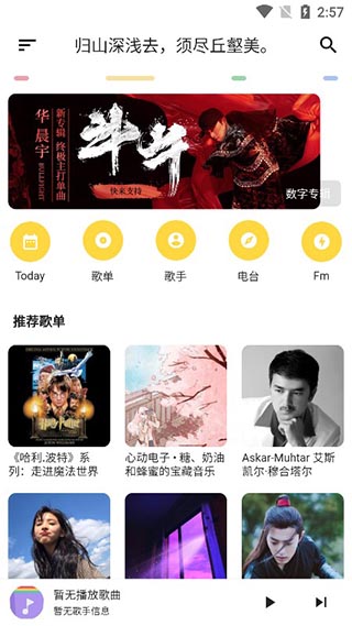 软件体积虽然小,但该有的版块一个不少,每日推荐、歌单广场、歌手、电台FM、排行榜,这些不错的音乐版块都完整收录。
