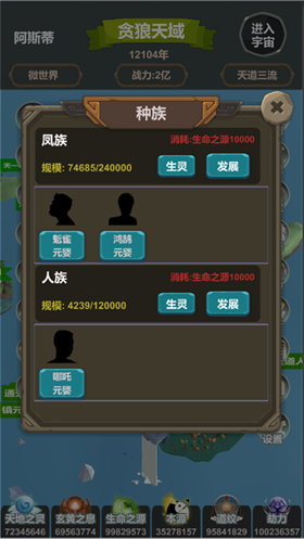 3.收集资源创造先天灵宝以及洞天福地,吸引不同的种族和任务游玩,解锁更多的力量,培养强大角色。