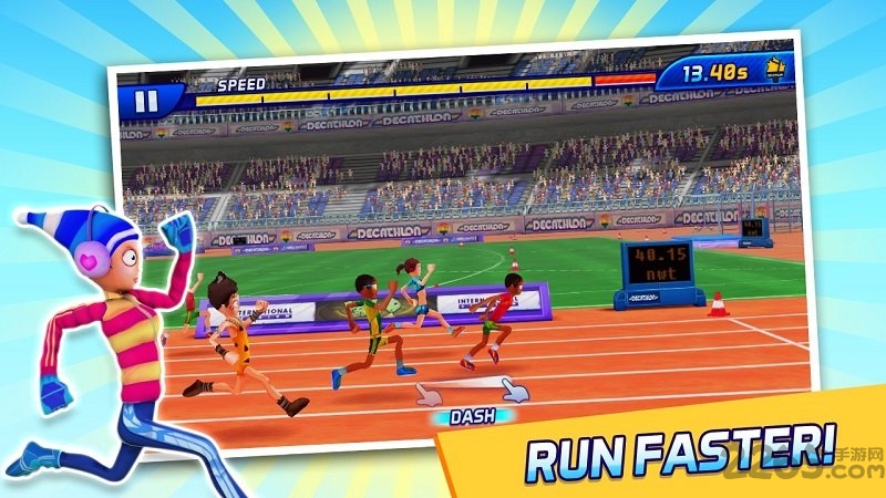 模拟在奥运会中十项全能的体育游戏,游戏中分为十个项目,如果你每个项目都能夺得冠军,那么是很了不起的。游戏可以选择多个国家语言,多个国家的参赛选手。游戏可以赚取经验来提升人物的全面属性:速度,耐力等等。商店中还可以购买到一些装饰人物的道具。游戏玩法简单,跟着教程走即可。