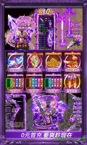 1.首充任意金额可得神兵利器!炫酷技能!开天神斩!火龙气焰!群体怨毒术!酷炫称号!顶级装备 黄金 屠龙!等级直升80级!