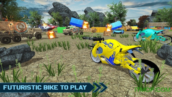 启动你的摩托车,并使用你的拍摄技术粉碎未来的汽车,完成惊险的任务。在战场上从一个部队移动到另一个部队并收集子弹和导弹以提高你的能力水平并成为自由漫游开放环境的自行车战场玩家。