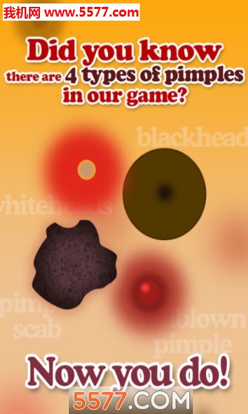 一款非常另类搞怪的游戏;三种要求使用不同手法来处理的痘痘;二合一的游戏类型,首先要能够找到隐藏痘痘(考眼力),然后放大并处理(考技巧);仿真的动作要求,需要玩家用两指做出捏的动作,很好地利用了多点触摸;5种不同的脸型,3种为女性,2种为男性;每种脸型都有逼真的声效;每关痘痘的位置都会随机生成,重复游戏性高。