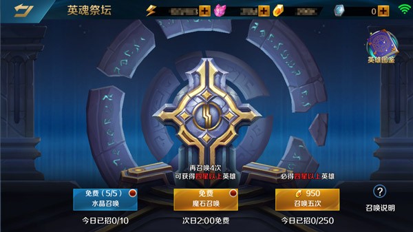 在“英魂祭坛”中,玩家可以通过消耗水晶或者魔石召唤英雄,玩家每天有指定的免费召唤机会,英雄的星级越高,能力和潜力越强。