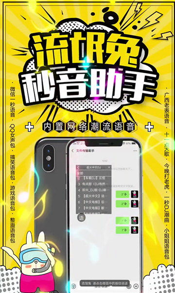 流氓兔秒音助手又名流氓兔语音包,APP全网独家首发一秒语音包资源,各种广西老表语音包、吃鸡语音包、一秒语音包、陌陌微信QQ语音包全部免费使用,时下最潮流语音包就选流氓兔哦!