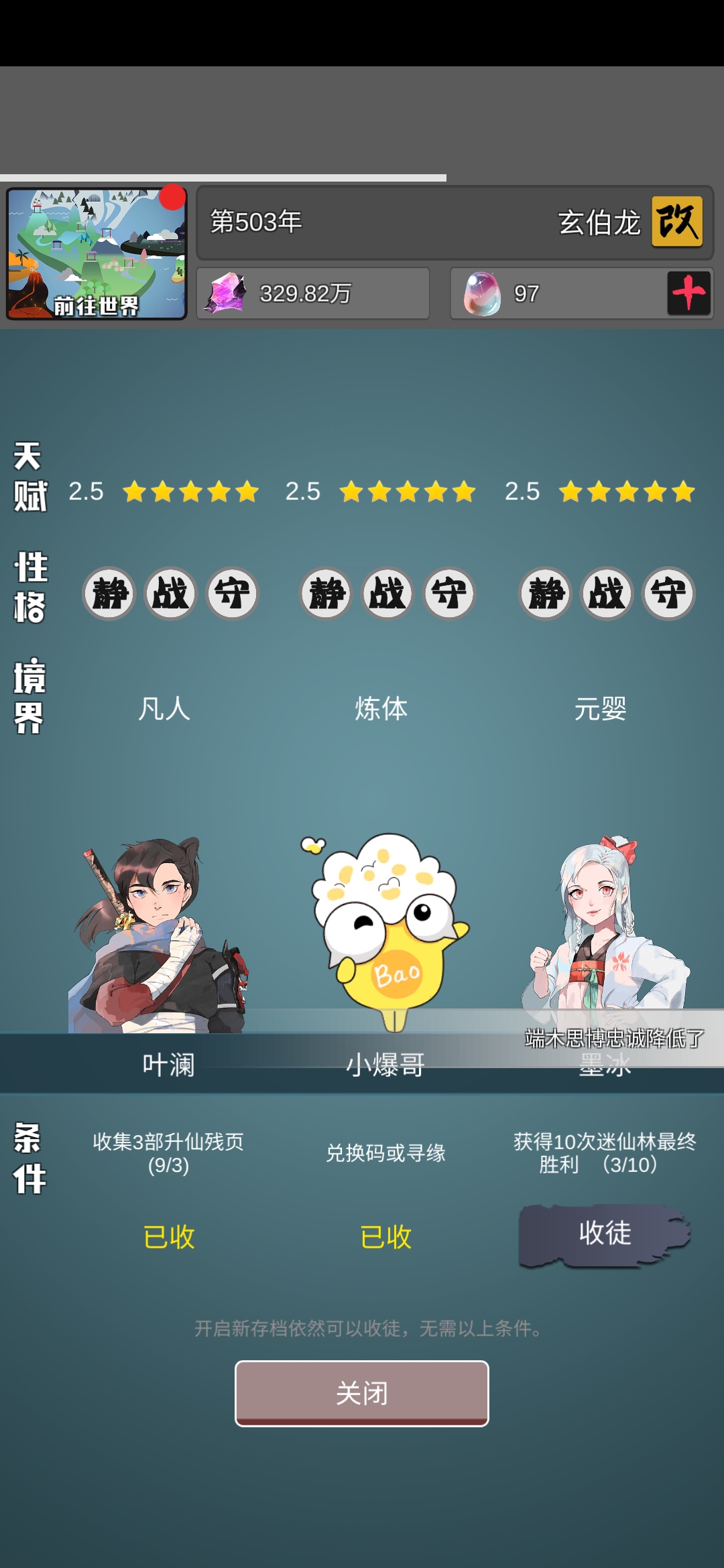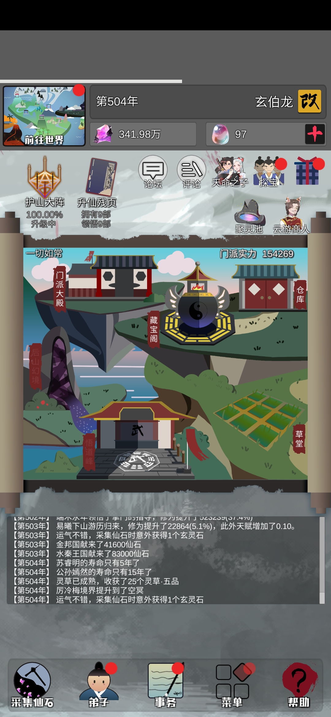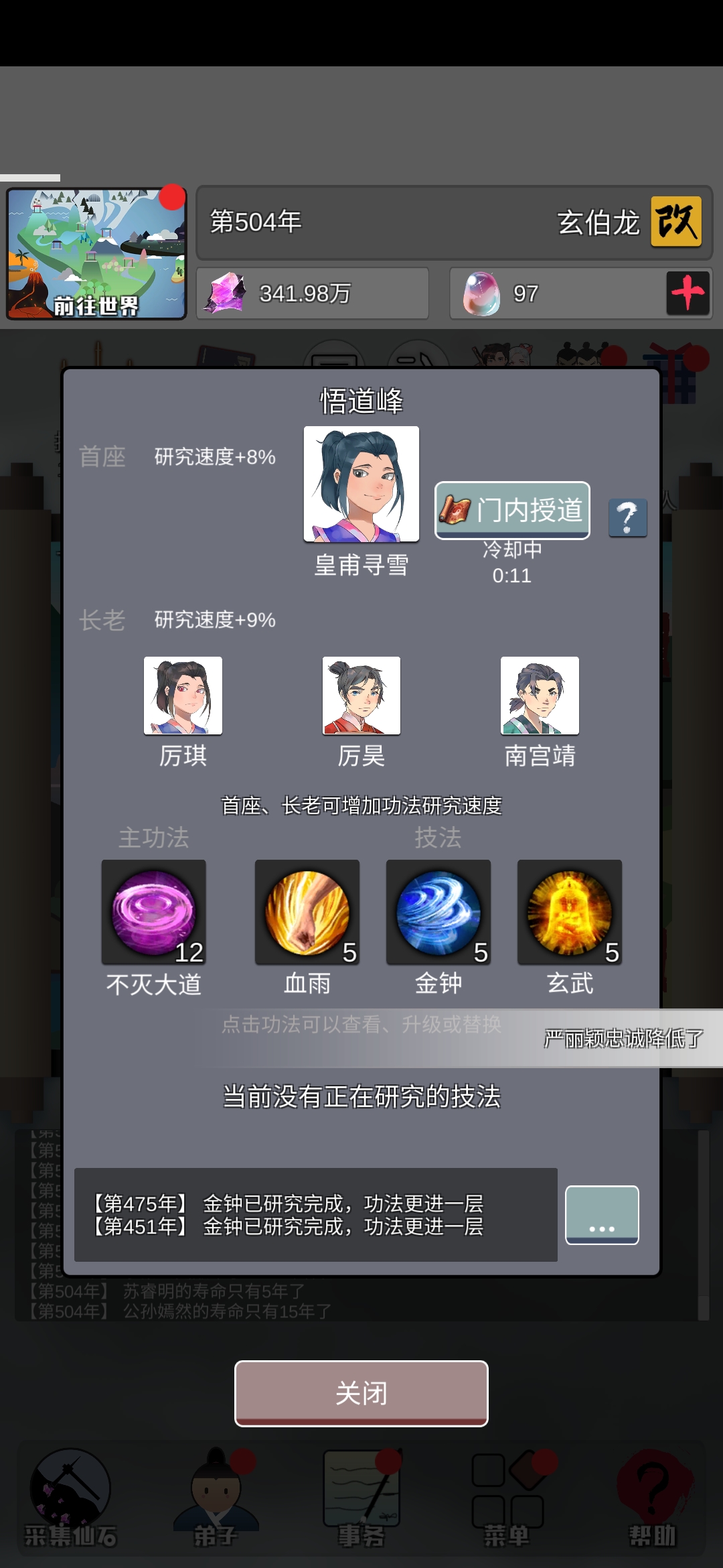 所以这个版本最简单的玩法就是结交其他门派,刷好感度。想有点挑战性的就考虑考虑去攻打门派,至于道源境弟子,就慢慢攒,我反正是暂不动了,现在已经八张残页了,道源境才17个。招的弟子最好还是练三星以上的,天赋在1.6以上的吧,1.6一下的后期基本上就死了,加寿命的药也不多,不可能照顾到每个弟子。