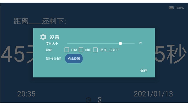 本应用是一款免费的 桌面时钟 app,UI风格简约舒适,时间、日期精准展示。同时,该app还具有倒计时功能,倒计时精确到秒。应用中有3种主题颜色可供选择,也可以自定义颜色,字体可随意调节大小,可横竖屏进行展示。