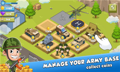 空闲的军队大亨手游是一款非常好玩的挂机放置类游戏,玩家在游戏中需要组建组建的军队,不停的培养它们,获得更多的金币,开阔更强大的军队。