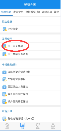 2、然后点击办税功能中的代开电子发票。