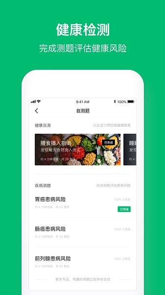 用户通过健康自测题,经大数据分析,专家团队为你提供健康的饮食生活习惯和药物正确选择方案。并且可以实时掌握家人健康状况,为心爱的他(她)多付出一份呵护。