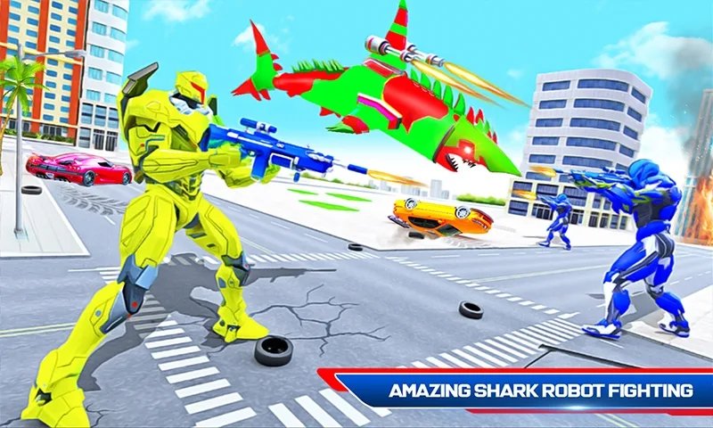 未来的 开放世界 现代城市环境探索,将飞行警车转变为愤怒的鲨鱼机器人游戏,以消除战争机器人游戏中的邪恶外星人力量。