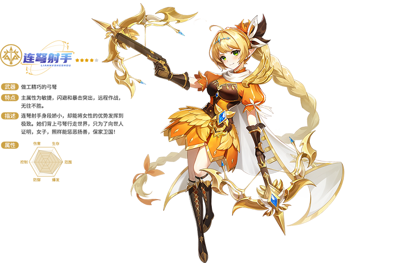 描述:连弩射手身段娇小,却能将女性的优势发挥到极致。她们背上弓驽行走世界,只为了向世人证明,女子,照样能惩恶扬善,保家卫国!