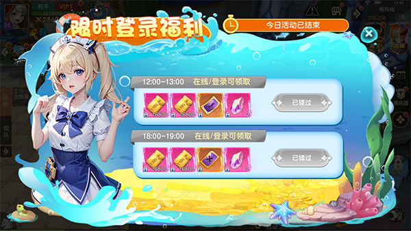 3、除了以上的每日签到奖励外,玩家在辛劳工作后的休息时间内(12:00-13:00)(18:00-19:00)两个时间段内进入游戏,即可领取限时登录福利。