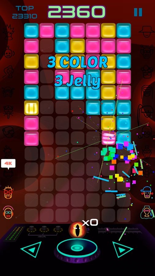 果冻DJ是来自 111%的游戏,这是这家开发商第一次尝试益智消除,把任意块拉下来,再发射出去,完成爆炸,细节还不错。