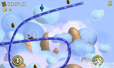 2、游戏的玩法很简单,和跑酷差不多,在屏幕下放有两个虚拟键,点击即可操作了,我们主要的任务是在绕来绕去的轨道上吃金币