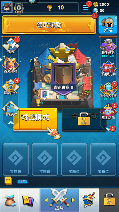 9、之后,进行同样的步骤,获得四个英雄,完成任务进度后,进入游戏首页,领取奖励;