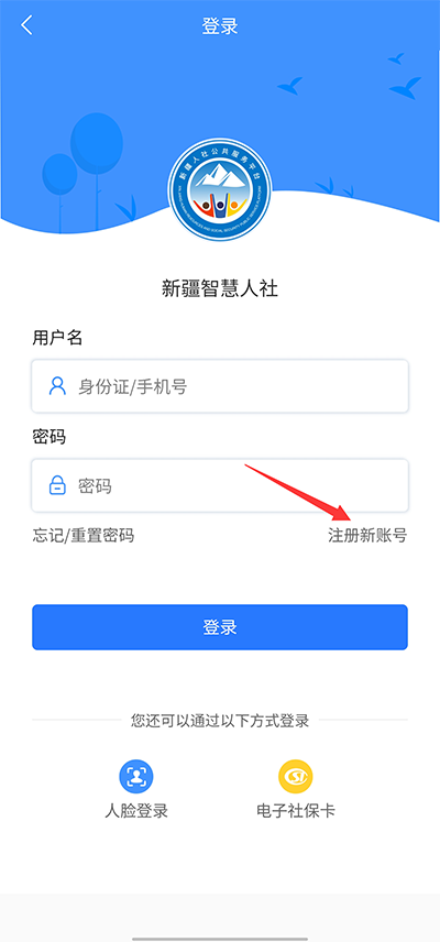 1、下载后打开进入新疆智慧人社app,在登录界面点击注册新账号