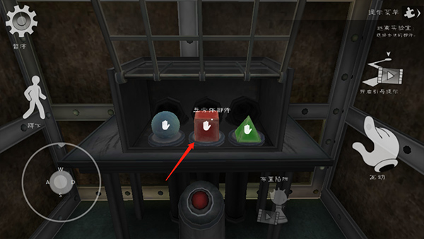 2、点击玩红色的按钮后,箱子打开了,你会看到这里面有一个蓝色的球、红色的正方体以及绿色的三角体,正好你会发现对面的荧幕上面有有个红色正方体的影像,这是不是某种提示呢。