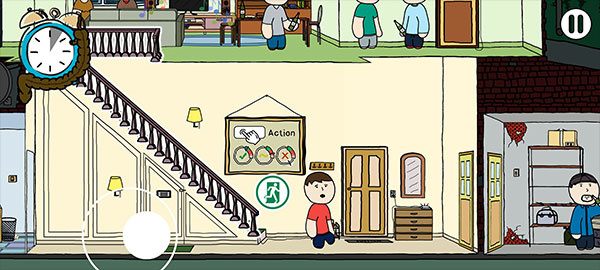 4、以派对为例,进入后左下角滑动可以呼出隐形轮盘,操控憋翔主人公移动探索房子,靠近物体或者人物,会显示气泡,点击气泡可以触发动作。