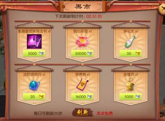 如果当前页面没有自己心仪的游戏道具,小主可以点击下方的刷新按钮,刷新后就会出现新的游戏道具。首次刷新免费,后面则需要消耗元宝才能刷新,每位小主每日只可以刷新20次。此外,系统每隔3个小时也会刷新一次黑市当前页面的游戏道具。